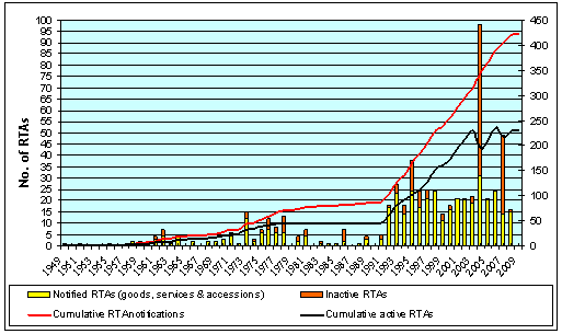 Next in the series of prognostications for 2009: look for companies to expand the benefit of low-cost country sourcing by leveraging the duty savings from preferential trade agreements. NAFTA was signed into law in 1993, and in the past decade the number of trade agreements has multiplied many times over. The World Trade Organization tracks this trend and has this nifty chart on the the number of trade agreements in force and also tracks the degree of change (see the solid lines) associated with "notifications" related to regional trade agreements